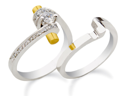 White and yellow gold engagement ring featuring a round center diamond and melee. Accompanied by a matching wedding band.