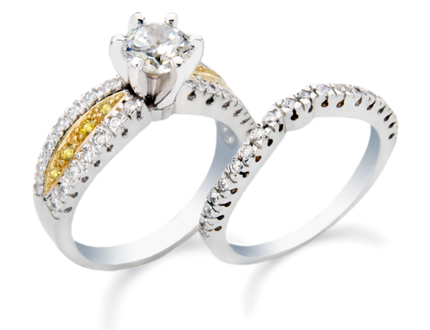 White and yellow gold engagement ring featuring a round center diamond with white and yellow diamond melee.